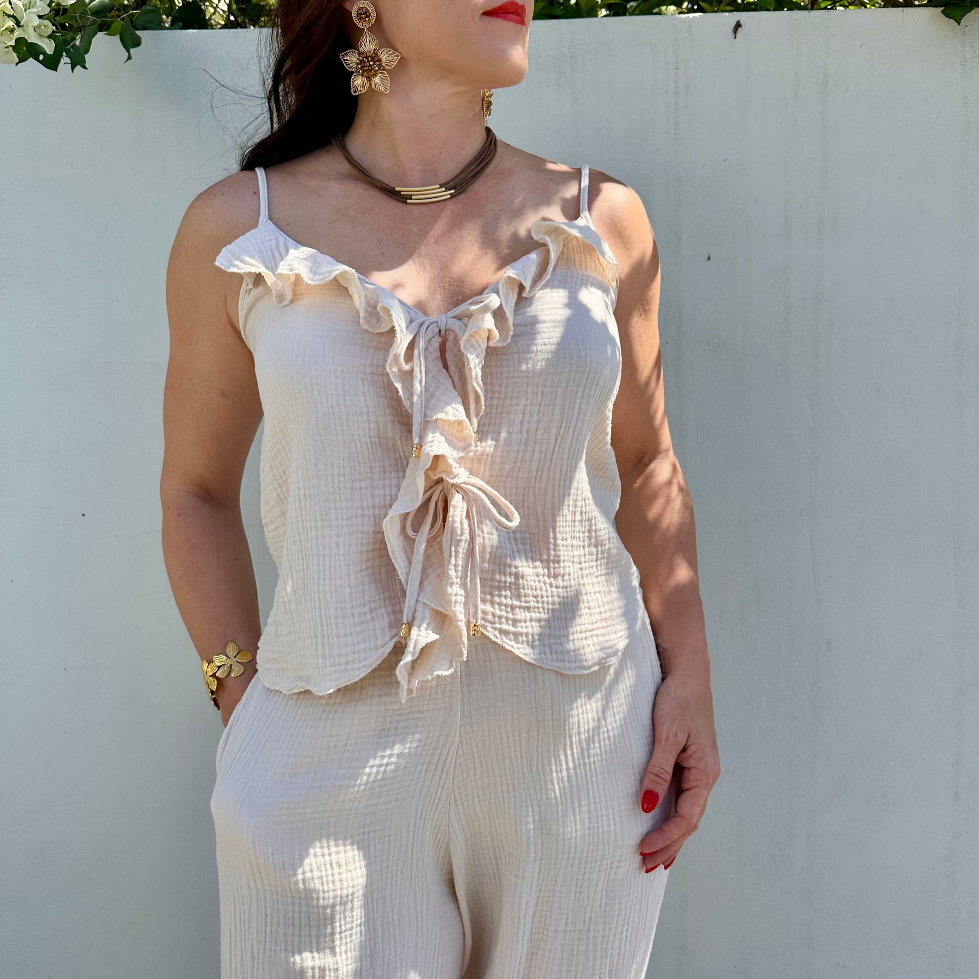 Made from soft cream cotton, it features delicate ruffles on the front and adjustable tie straps with a subtle gold accent at the ends. Its romantic silhouette strikes the perfect balance between classic and modern, ideal for sunny days, getaways, or effortless everyday style.